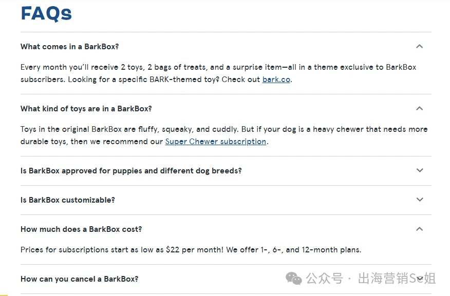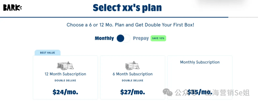 定期订阅,形成稳定收入流:BarkBox采用了订阅制,顾客每月都会收到一个新盒子。这个模式不仅为品牌带来了稳定的现金流,还确保了客户的长期粘性。对于很多宠物主人来说BarkBox成为了他们每月必买的产品,形成了强大的用户依赖。