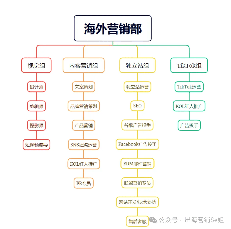 以下是海外营销部的组织架构图,一般中小型企业以内容营销组的搭建作为营销业务从0到1的突破点,这类人员招聘难度不大,市场选择较多,可以低成本启动。同时也能服务于现有跨境电商业务做增量,团队稳定性强。
